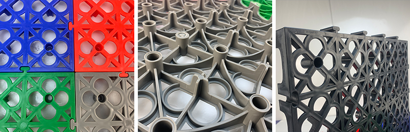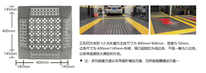 1. 分為3.4.5.厚度,解決不同厚度,統(tǒng)一紋路的問題 2. 啞光平紋設(shè)計,防滑,美觀,易清潔 3. 選用高級原料,加入其他輔料,顏色亮麗,無異味,無污染 4. 顏色為紅黃藍(lán)綠黑灰六色,滿足客戶用色需求,搭配屬于自己的風(fēng)格 5. 通扣鎖扣設(shè)計,容易鋪設(shè)且容易拆卸打理 6. 加強支撐,不容易出現(xiàn)壓壞壓斷現(xiàn)象,滿足大多數(shù)車輛施工的要求 7. 使用年限長,五年超長質(zhì)保,使用無后顧之憂 8. 十字支撐,保證承載最大化的同時,且易排泥排水