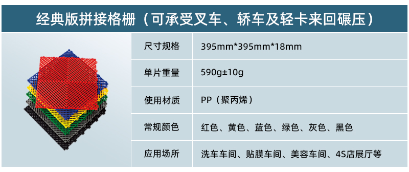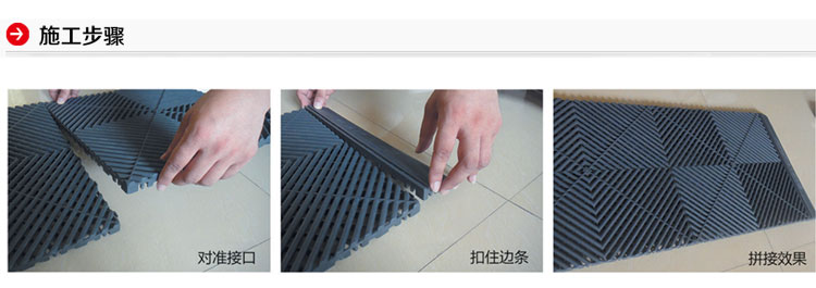 多功能拼接格柵具有高強(qiáng)承載、防水防油、色彩絢麗、施工簡便、防水防污、無臭無毒等諸多優(yōu)點(diǎn),廣泛應(yīng)用于家庭陽臺(tái)、汽車美容快修店、汽車4S店、洗浴中心、公共衛(wèi)生間、展覽展會(huì)、賓館酒店過道等場所。