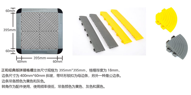 一套完整的拼接格柵產(chǎn)品由主體格柵、公邊條、母邊條、轉(zhuǎn)角四部分構(gòu)成,主體格柵的尺寸為395mm*395mm*18mm,厚度為18mm,邊條尺寸為400mm*60mm*8mm,轉(zhuǎn)角為扇形結(jié)構(gòu),尺寸規(guī)格為60mm*60mm*18mm。 拼接格柵通過一個(gè)簡便互鎖接口設(shè)計(jì),重量輕,可拆卸,易于安裝。無需使用工具,即可快速構(gòu)建起堅(jiān)實(shí)的展示地板地面。 拼接格柵重量輕、結(jié)構(gòu)緊湊,便于運(yùn)輸或儲(chǔ)存?蓮V泛用作汽車4S店展臺(tái)地板、汽車美容店地面、汽車貼膜車間、美容車間以及客戶休息室等場所,同時(shí)也適用于展覽、展會(huì)等臨時(shí)性場所的地面鋪設(shè)。在幾乎所有有水的場所拼接格柵都能使用。