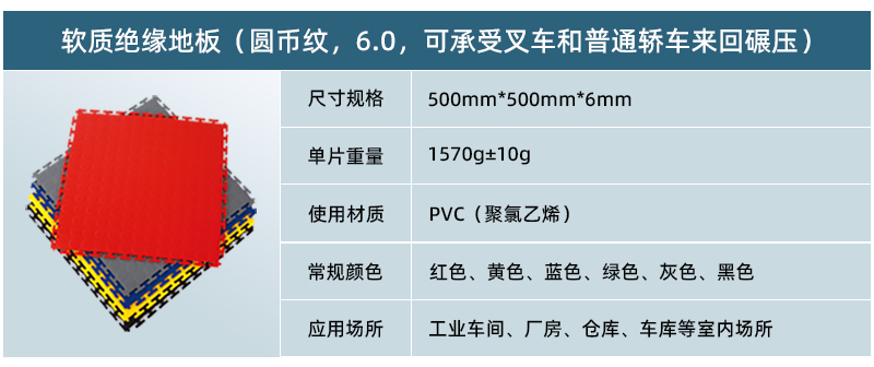 軟質(zhì)絕緣地板采用純新軟性PVC(聚氯乙烯)生產(chǎn)而成,具有防滑、防油、靜音、抗沖擊、高承載等特點(diǎn),可以快捷安裝在任何現(xiàn)有的基板,包括木材,混凝土,環(huán)氧樹脂,瓷磚,水磨石等,廣泛應(yīng)用于車間廠房地面、倉(cāng)庫(kù)地面、車庫(kù)地面、健身房、展廳等場(chǎng)所。