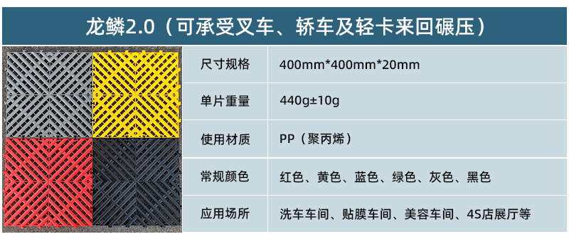 1.龍鱗紋設(shè)計,防滑,美觀,寓意好 2.選用高級原料,加入其他輔料,顏色亮麗,無異味,無污染 3.顏色為紅黃藍綠黑灰六色,滿足客戶用色需求,搭配屬于自己的風格 4.通扣鎖扣設(shè)計,容易鋪設(shè)且容易拆卸打理 5.加強支撐,不容易出現(xiàn)壓壞壓斷現(xiàn)象,滿足大多數(shù)車輛施工的要求 6.使用年限長,3年超長質(zhì)保,使用無后顧之憂 7.不同厚度,采用不同支撐,保證承載最大化的同時,且易排泥排水