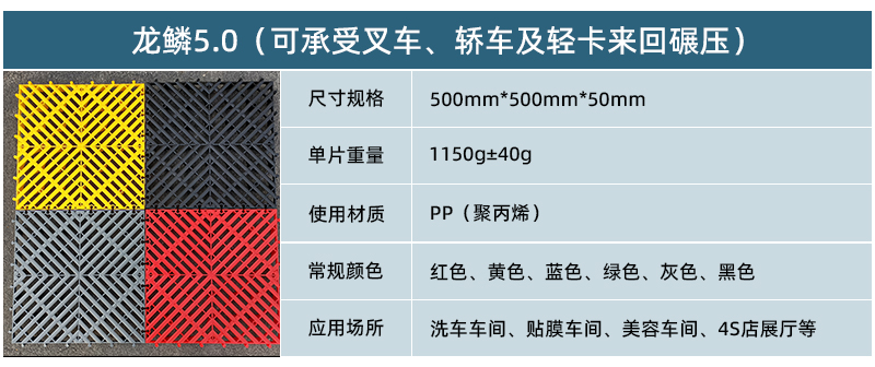 1.龍鱗紋設(shè)計(jì),防滑,美觀,寓意好 2.選用高級(jí)原料,加入其他輔料,顏色亮麗,無(wú)異味,無(wú)污染 3.顏色為紅黃藍(lán)綠黑灰六色,滿足客戶用色需求,搭配屬于自己的風(fēng)格 4.通扣鎖扣設(shè)計(jì),容易鋪設(shè)且容易拆卸打理 5.加強(qiáng)支撐,不容易出現(xiàn)壓壞壓斷現(xiàn)象,滿足大多數(shù)車輛施工的要求 6.使用年限長(zhǎng),3年超長(zhǎng)質(zhì)保,使用無(wú)后顧之憂 7.不同厚度,采用不同支撐,保證承載最大化的同時(shí),且易排泥排水